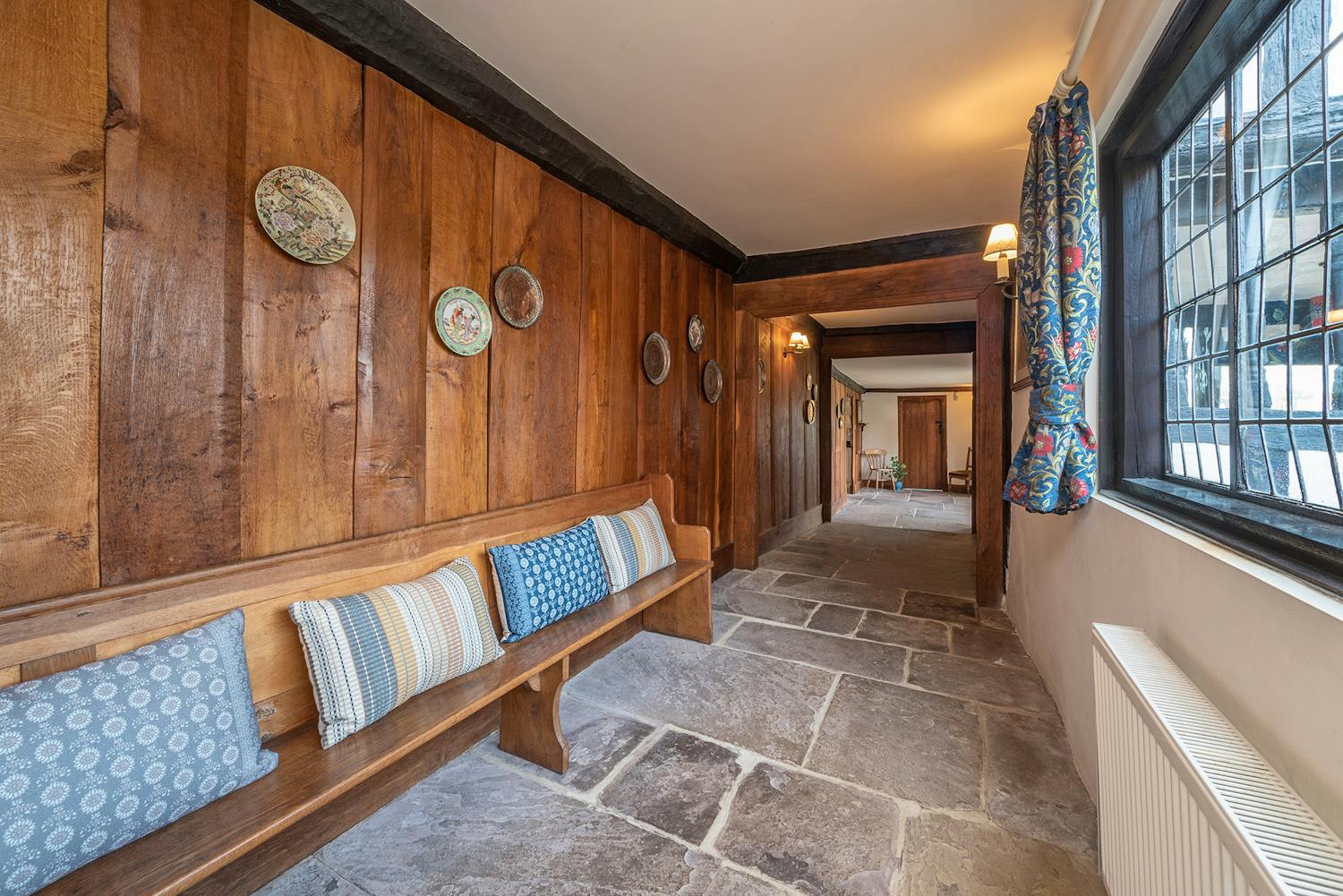Luntley Court: Original oak panelling and flagstone floor in the long hallway -