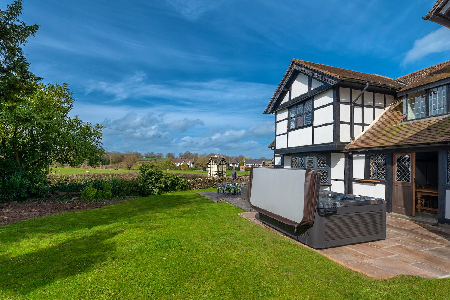 Luntley Court: Relax in the hot tub with views over the fields -